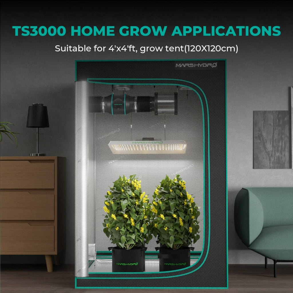 TS3000, as the biggest LED grow light in TS series, offers enough coverage for 4x4 ft area with affordable price and quality yields; in return, it's able to be applied to both home cultivation and commercial veg cultivation.