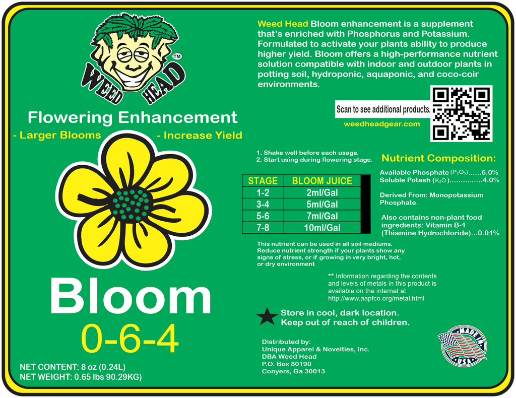 Weed Head™ Bloom Enhancer is a highly concentrated flowering additive expertly developed using a premium blend of phosphate, potassium, and vitamin B1. This advanced formulation is designed to stimulate faster blooming while improving flower size, density, and overall quality—supporting yields of up to 30% higher. Easily incorporated into any feeding program, Bloom Enhancer helps deliver an abundant display of high-quality blooms throughout the flowering phase.